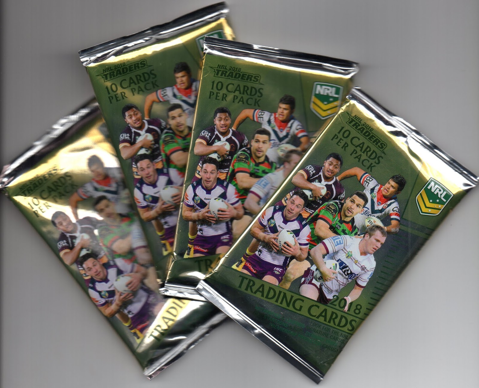 One of the cool things that I love about this community is the people I get to meet. Through my sumo blog, I met an Aussie collector (Karl) working down in Indonesia. He has been helping me work on the Japanese Sumo Wrestling Trump (Playing Card) sets where I am trying to catalog all of them from 1975 to current. We've traded a few items back and forth and the latest items I am the recipient of are 4 packs of 2018 National Rugby League Traders. I know very little about rugby, but am excited to have these cards and am hoping to learn more. I have since come to learn that there are two types of rule sets for Rugby: League and Union. With respect to this set, there are a whole host of inserts in these 10-card packs. A quick search of eBay also shows a cool album I may have to snag. I'm going to open two packs, and keep the other two sealed for the future. Let's see what I get:
