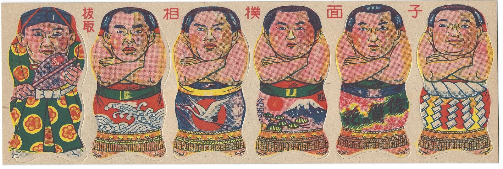In the 1930s, this game seemed to be all the rage as I have dozens and dozens of R-series menko that were cut along the bottom and along their arms to allow them to stand and engage in paper sumo. Here are three such examples from the R392-2: 1939 Rikishi 4-5-6 set.